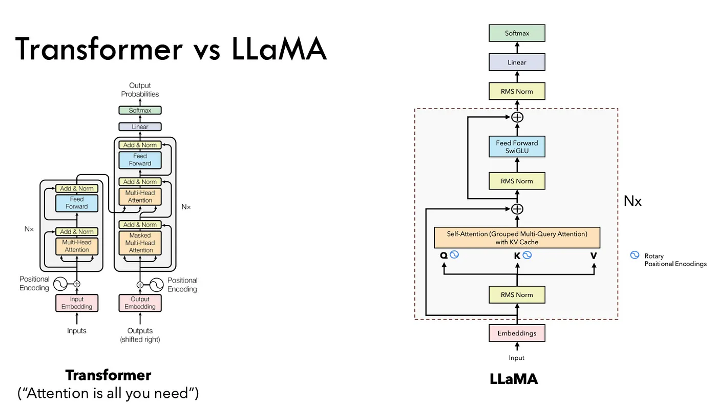 아래 그림은 llama 모델과 Attention is all you need 논문에서 소개되었던 Transformer 구조와의 다른 점을 보여준다. RMS Norm 이라는 개념과 Grouped Multi-Query Attention 그리고 KV Cache 라는 개념이 눈에 띄는데 각각에 대해서 자세히 살펴보도록 하자.