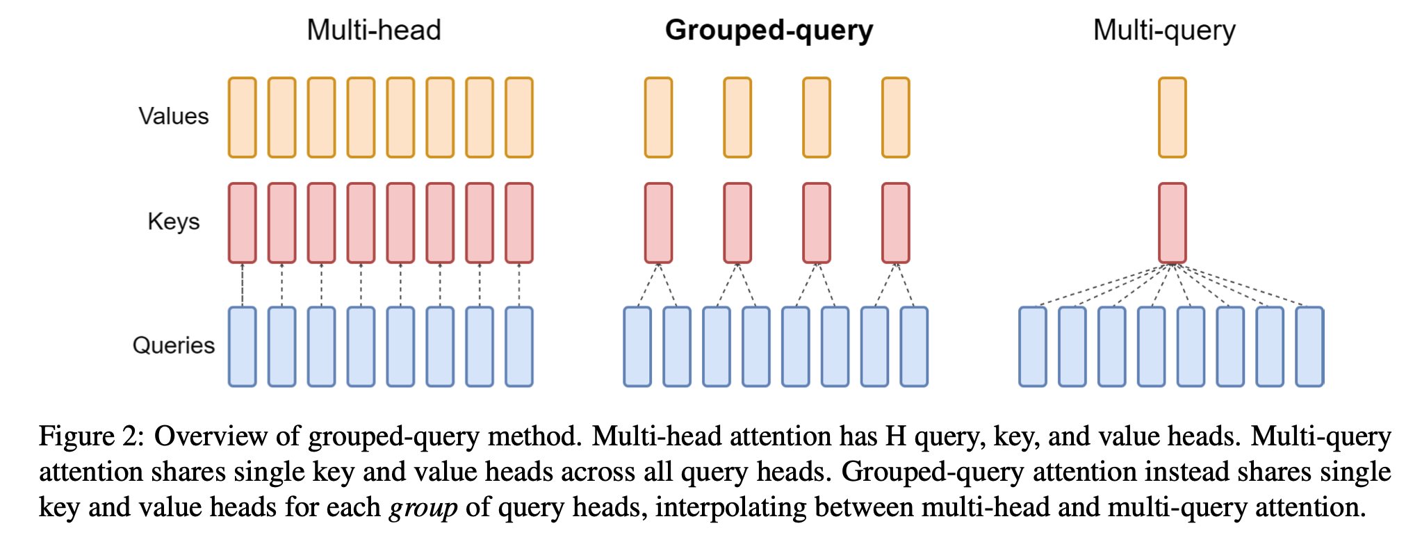 구글의 GQA 논문에서 처음 제시된 아이디어로 LLaMA 1 과 LLaMA 2 를 구분하는 큰 특징 중 하나라고 한다. 개념은 단순하다. K, Q, V 를 head 개수만큼 동일하게 쪼개서 연산하는게 MHA 이라면, GQA 는 Q 는 head 만큼 있고 K, V 는 head 의 약수 개로 이루어져 있는 건데 아래 그림을 참고하자.
